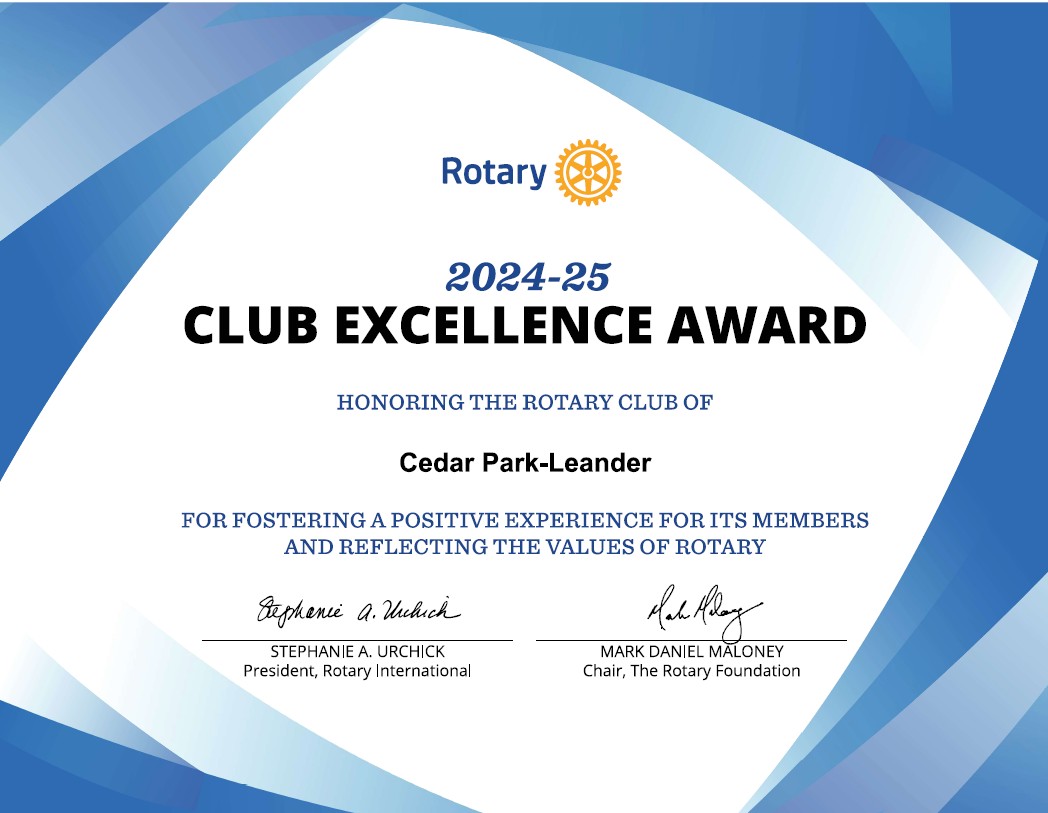 The Cedar Park- Leander Rotary Club has been honored with the 2024-25 Rotary Club Excellence Award, recognizing the Club’s outstanding commitment to service, fellowship, and leadership in the community.