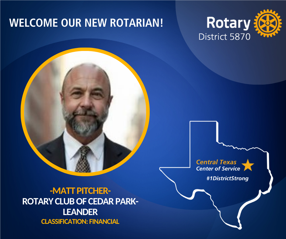 Please join us in giving Matt a warm Cedar Park-Leander welcome as he begins his Rotary journey of fellowship, service, and impact in our community!